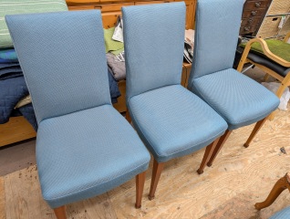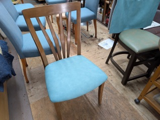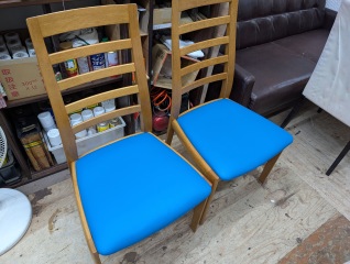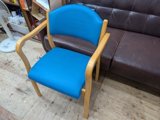しばらく休んでおりました日記再開しました。今日の椅子は介護施設でお使いチェアー。空色ブルーフェイクレザーでの張替完了写真です。良い感じ