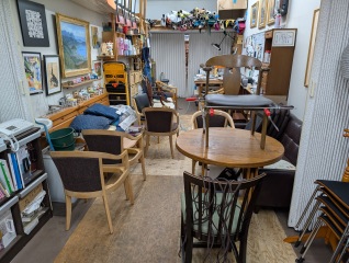 手狭な工房に椅子たちが雑然と並んでいます。時々、工房の内部写真を撮ることで自分が振り返る記録になるのとお客様の椅子の預かりを確認できます。 |