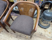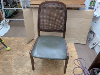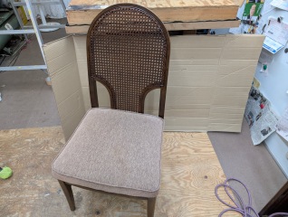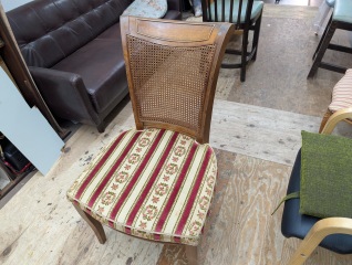 カリモク製の椅子。背中の部分は籐でした。今回はお任せ生地で張替ました。 |