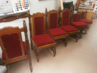 写真は今日の作業場です。張替が終わった椅子とこれから張替る椅子。張替中の椅子を並べてみました。当店は写真のようなダイニングチェアーの張替が1番多いです。次いで店舗の椅子。そしてソファーの張替です。どうしてもダイニングチェアーは数が多いのでソファーの張替は十分お時間を頂かないと御受けしておりません。店舗の椅子の場合は事前にお話合いの上、日程を決めております。