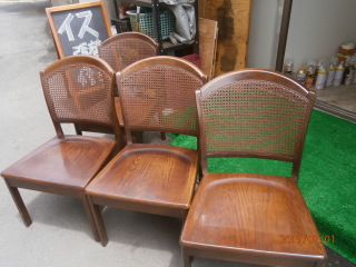 土曜日は午後から法事でご迷惑おかけいたしました。今日は籐の張替が中心でした。色の濃淡は乾燥度のちがいです。完全に乾燥後下地処理をし着色艶出しを施します。前の椅子は四つ目編みの籐で後ろの椅子は篭目編みを張りました。